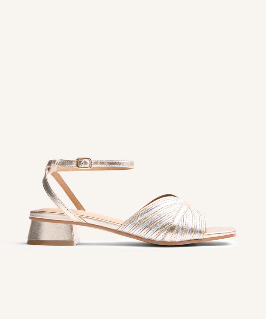 - סנדל עקב עם רצועות עור בגימור מטאלי