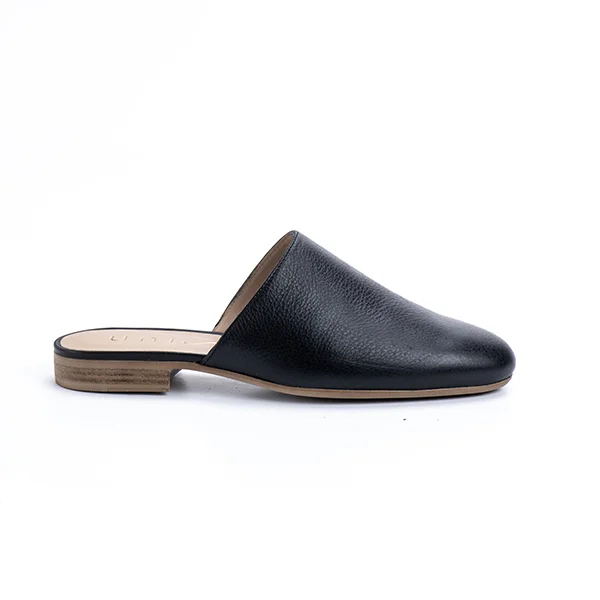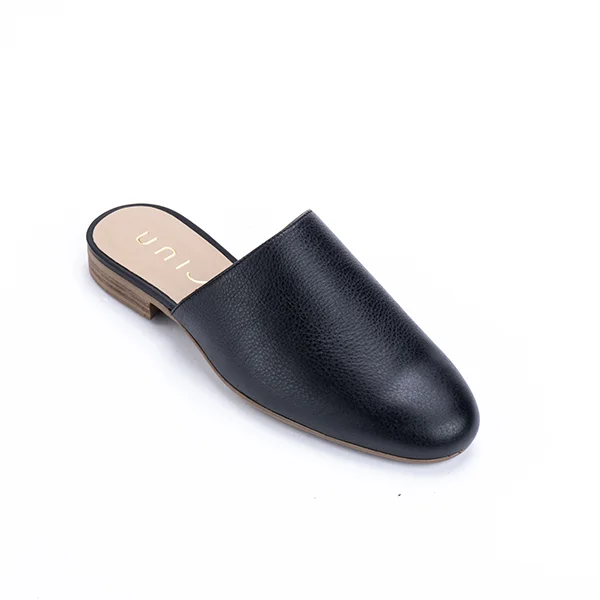 DOJAN – כפכף שטוח מעור שחור. פנים מעוגלות ועקב בגבוה 1.5 ס”מ.