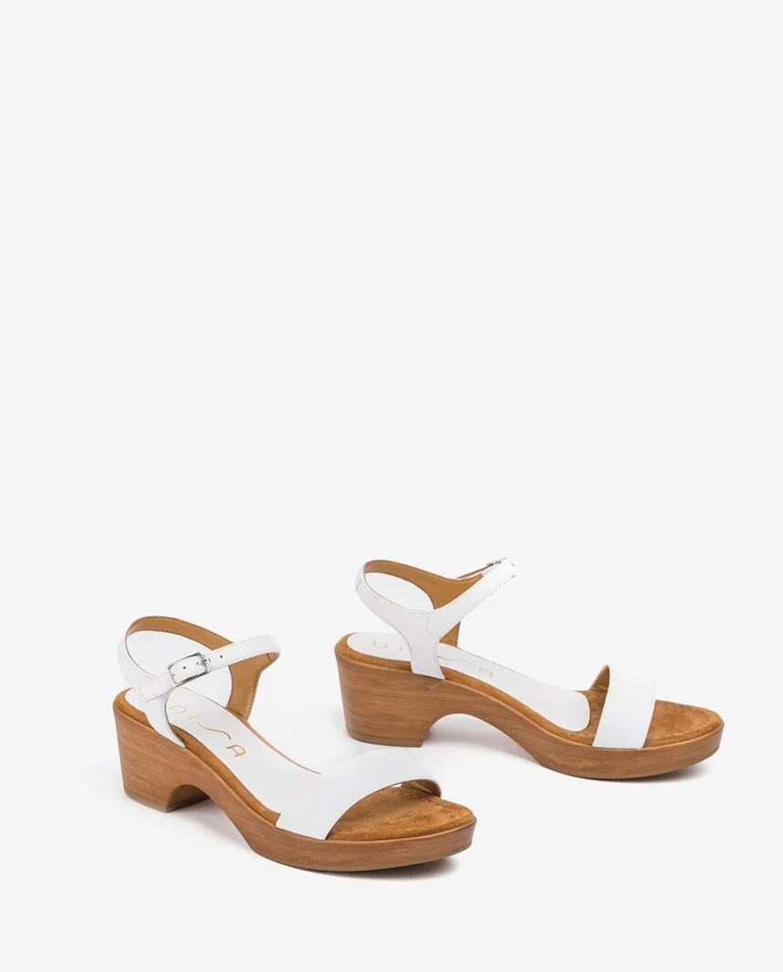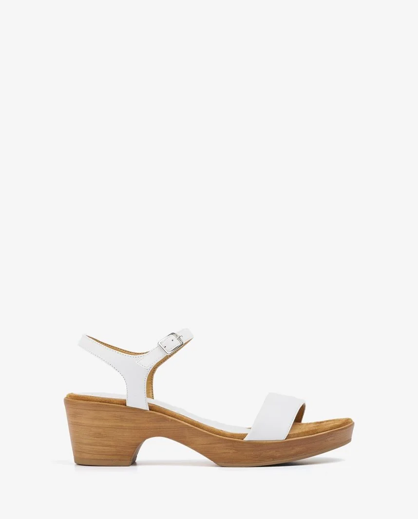 IRITA – סנדל עור לבן. סגירה ע”י אבזם סוליה יציקה PU עם עקב 5.5 גבוה ופלטפורמה בגודל 2 ס”מ.
