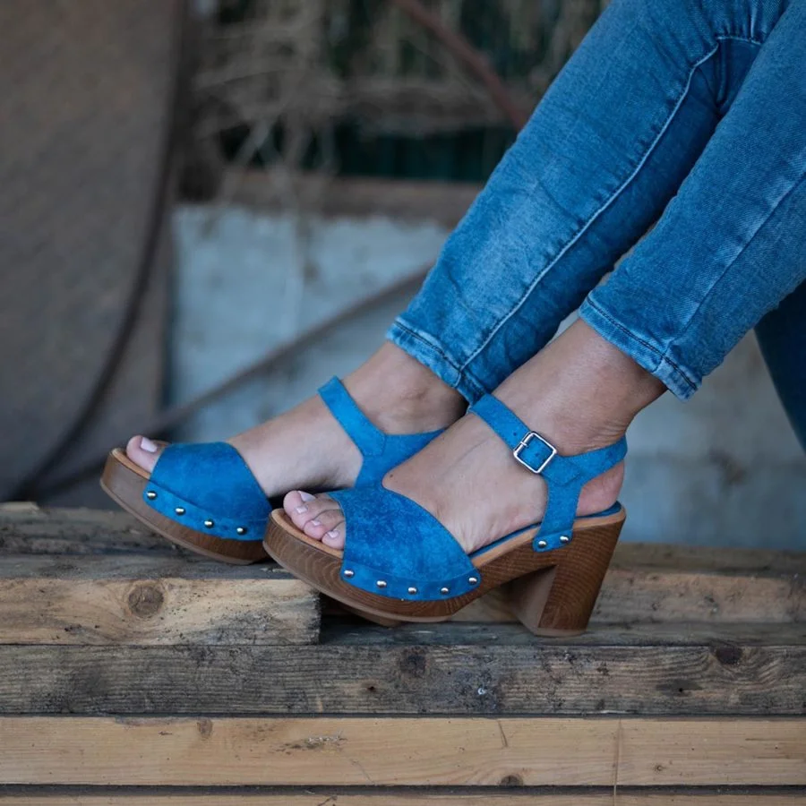 TACO-סנדל עור גינס עקב בסגנון עץ בשילוב ניטים זהובים. סגירה ע”י רצועת קרסול עם אבזם מתכוונן.
